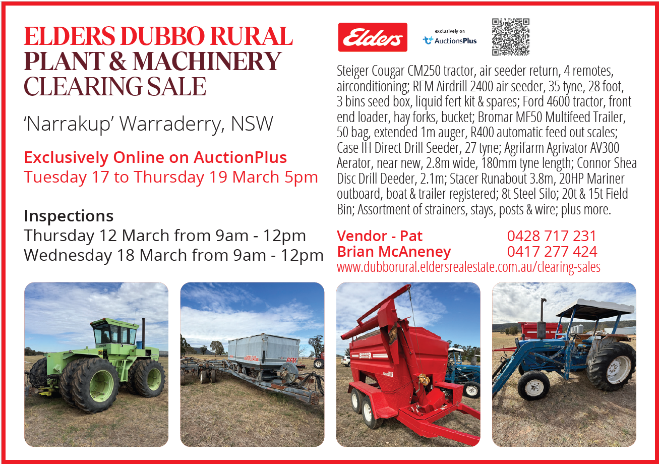 Steiger Cougar CM250 tractor, 250HP, air seeder return, 4 remotes, air conditioning, manual (original), 10,311hrs, 30% tyres; RFM Airdrill 2400 air seeder, 35 tyne, 28 foot, tyres 35%, 4 cameras – 1 each bin, in cab screen, in cab electronic controller, 3 bin seed box, 1 set up as small seed, new seed meter, rollers and bearings, coil packer harrows, full manual & calibration, liquid fert kit, assortment of spares, tynes and springs; Case IH 5126 stamped John Shearer frame Direct Drill Seeder, box raised, 27 tyne, tyres 95%, small seed box, manual; Ford 4600 Tractor 1982, 3223hrs, one owner, original condition, original manual and purchase receipt, front end loader, hay forks, bucket (gp); Bromar MF50 multifeed Trailer, 2020, extended Auger – 1m, 50 Bag, Honda motor, extra heavy 50mm chassis, R400 Boch scales, rollover tarp, electric trail feed, electric in/out gear fitted MF0025174 – serial number; Aerator – New Agrifarm Agrivator AV300, done 10ha, near new, 180mm tyne length, 3PL, 2.8m wide; Kurrajong 1000 Spreader (needs work but functional) tow behind spreader, PTO driven; Crown Slasher 2.2m tow behind, PTO, rough, needs work; Diesel Overhead tank, 2200 litre, needs work; Ford Ranger Tyres, 4 x Dunlop AT22 grandtrek 17 inch rims; Connor Shea tynes, pallet of; Plastic foot bath; Steel Silo – 8t, good fert/seed silo; Fire Harrows, needs work, centre length 3350, 2 wings 2660, overall 8360; Tyre Roller needs work 6100mm; Field Bin x 1 (20t), working order, needs tyres, no floor rust; Field Bin x 1 (15t), floor rusted out; Connor Shea Disc Drill Seeder, 3PL, 2.1m working width, seed/fert boxes; Sunbeam Overhead Gear x2 , old grinder, on pallet; Pallet of Tools; Yamaha DT200, unknown condition, tyres – front 30%, back 60%, with cardboard box; Husqvarna Bikes,2008 Husqvarna TE510, spares only, not in running condition, last ride stopped about 6 months ago and hasn’t been pulled down to fix; comes with complete spare 2009 Husqvarna TE510, complete, project, with pallet. Enduro tanks guards and seats all in good condition; Stacer Runabout 3.8m, forward controls, 20HP Mariner outboard, bimini, Rego – Trailer F46176 expires 10/08/2026, Boat RB240N expires 10/02/2027; Gas hot water system, unknown condition; Honda Quad TRX 420, 2008, tyres front 15%, back 20%, starts, runs intermittently; Te Pari Auto Drench Gun, brand new; Rheintechnik Preg Scanner; Grease Guns x2; HR Holden spares; John Deere 444 loader. No engine, no bucket. As is where is; Steel frame timber floor, incomplete raised dog cage base; Stays and Posts, 24 steel stays – 4 strainers; Hinge joint & Netting, 10 part rolls of hinge joint and foot netting; Hinge joint & Gates, 6 part rolls of used hinge joint and 2 old gates; Wire spinners; Wire, pallet of barb wire and plain wire Hinge joint roller; Assortment of tyres. Some with rims; Steel posts, pallet of Steel Star pickets – used; Multiple IBC’s, non chemical, food safe;