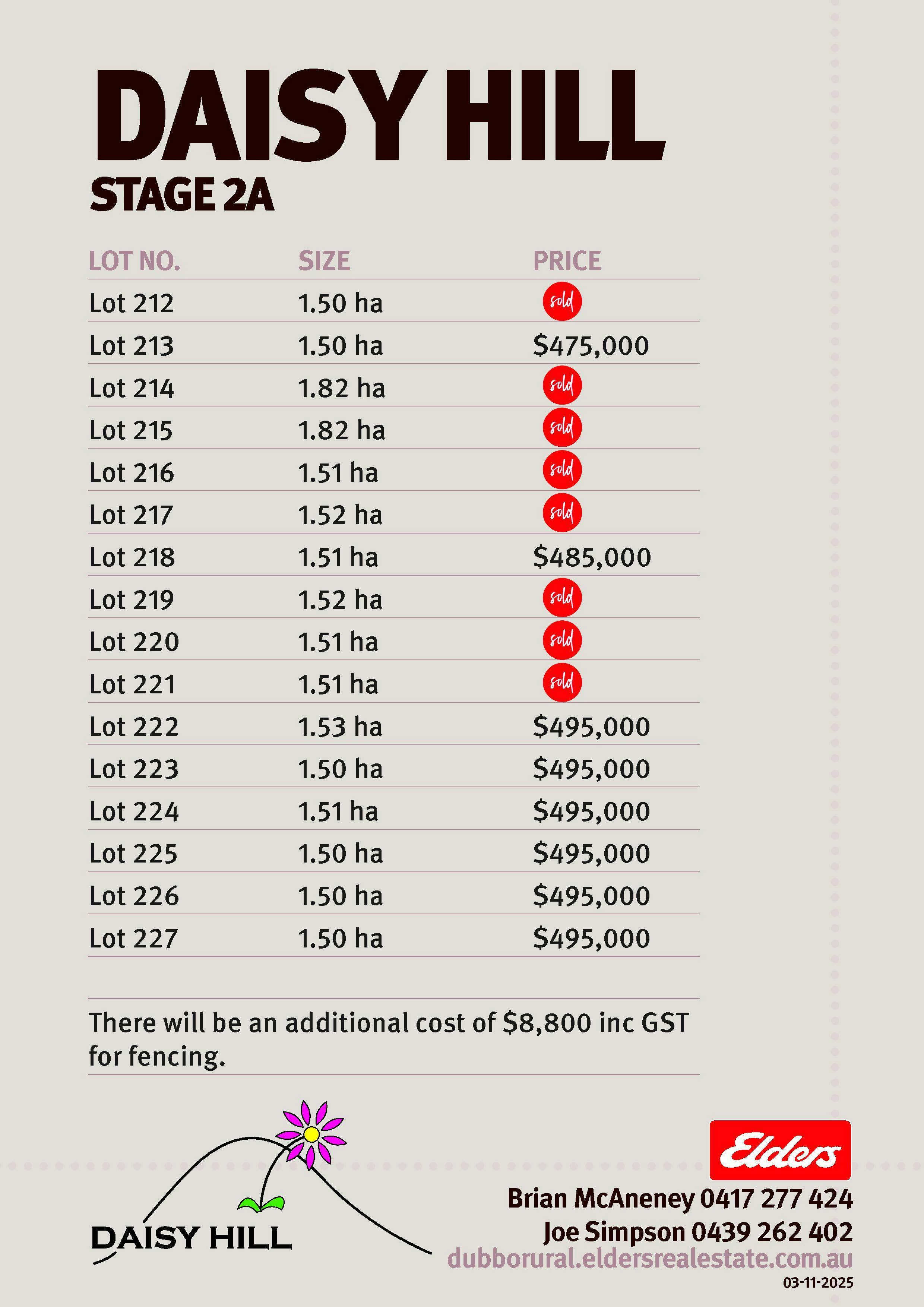 All lots come with town water, power to the boundary, concrete crossovers and fenced on 3 sides.